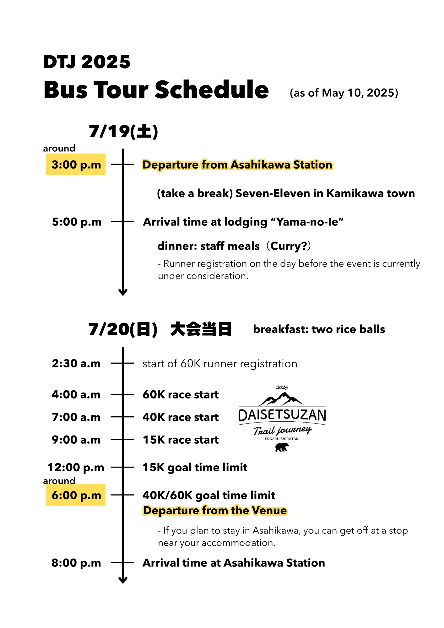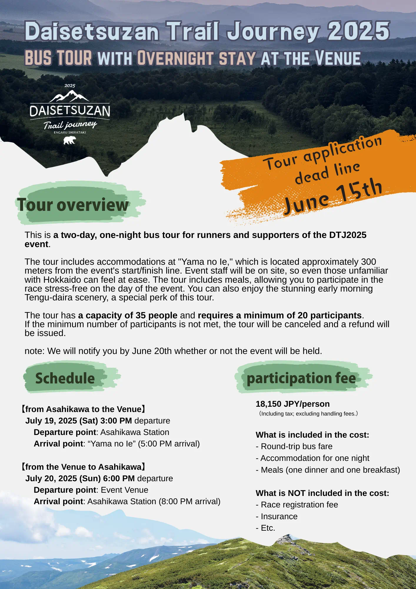 This is a two-day, one-night bus tour for runners and supporters of the DTJ2025 event.